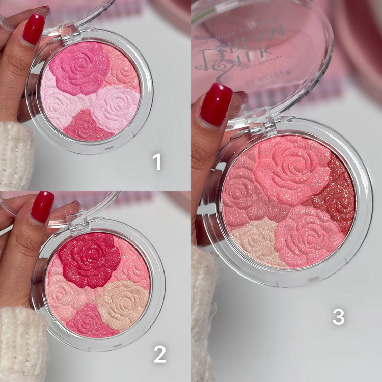 🔵 آیا میدانستید؟ (جادوی بافت ابریشمی و ترکیبی) روی بستهبندی این محصول کلمه “Silk Dream” (رؤیای ابریشمی) درج شده است. پودر فشردهی این محصول به هیچ وجه حالت گچی ندارد. از طرفی، در رژگونه هایلایتر گل رز شما فقط با یک رنگ روبهرو نیستید؛ بلکه هر پالت ترکیبی از ۳ تا ۴ سایهی همخانواده (روشن تا تیره) است که وقتی براش را روی کلِ پالت میچرخانید، یک رنگِ ترکیبیِ فوقالعاده رویایی و بینقص به دست میآید.